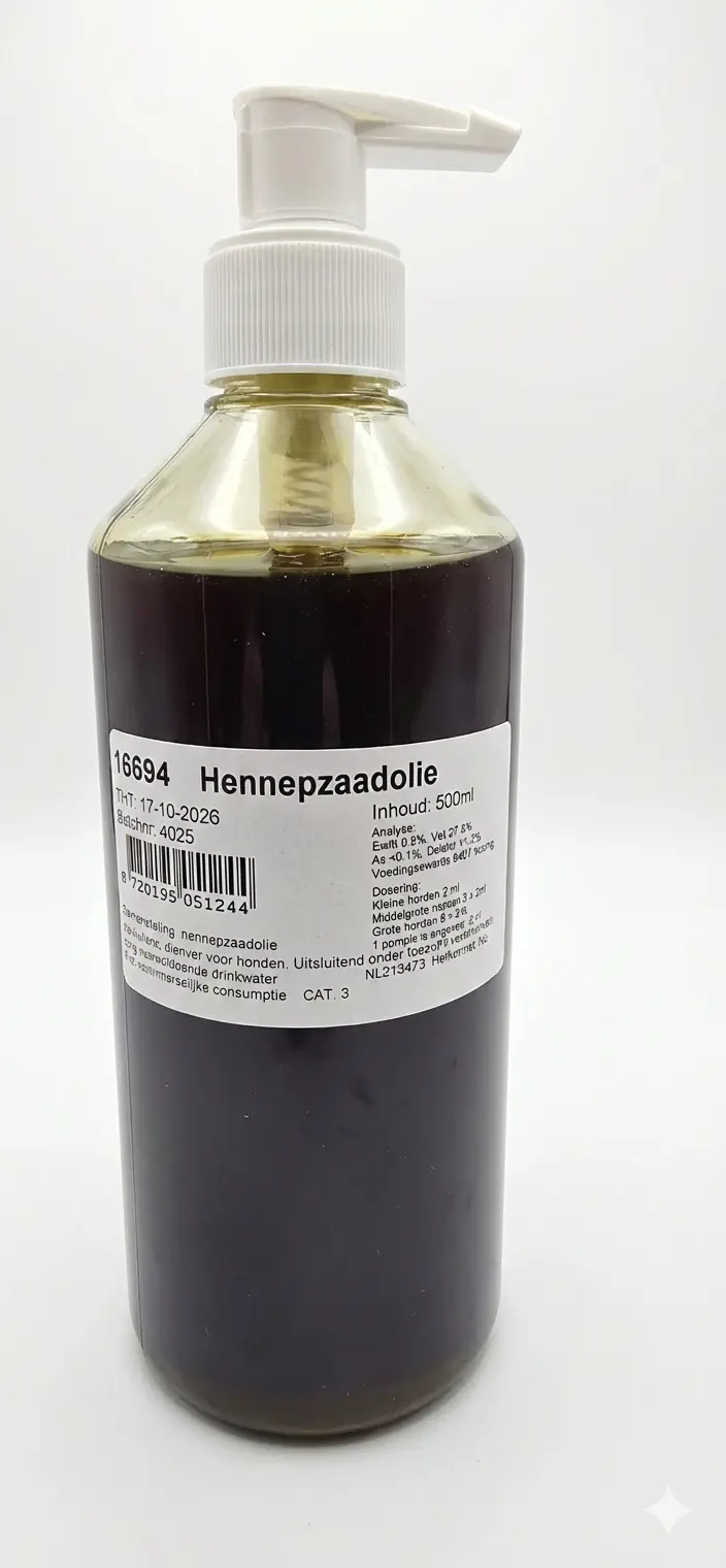Hennepzaadolie staat bekend als een van de meest voedzame oliën in de natuur. Het bevat de perfecte verhouding Omega-3, Omega-6 en Omega-9 vetzuren. Omdat het lichaam van de hond deze essentiële vetzuren niet zelf aanmaakt, is dit supplement een waardevolle toevoeging aan de dagelijkse voeding (zoals onze Cenaturio brokken).