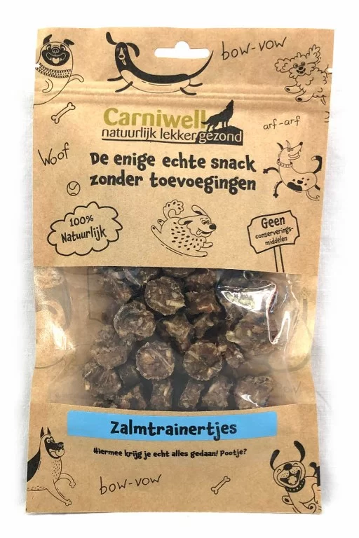 Onweerstaanbare trainertjes, waarmee je alles gedaan krijgt! Ideaal voor bij de training of lekker als tussendoortje! De Carniwell Zalmtrainertjes zijn een onweerstaanbare en natuurlijke beloning om je hond te motiveren. De trainertjes bevatten bovendien één eiwitbron (100% Zalm), hierdoor zijn de Carniwell-trainertjes ook geschikt voor honden met allergiën, voedsel-intoleranties en voor honden die op dieet zijn. Zalmtrainertjes zijn rijk aan eiwitten.